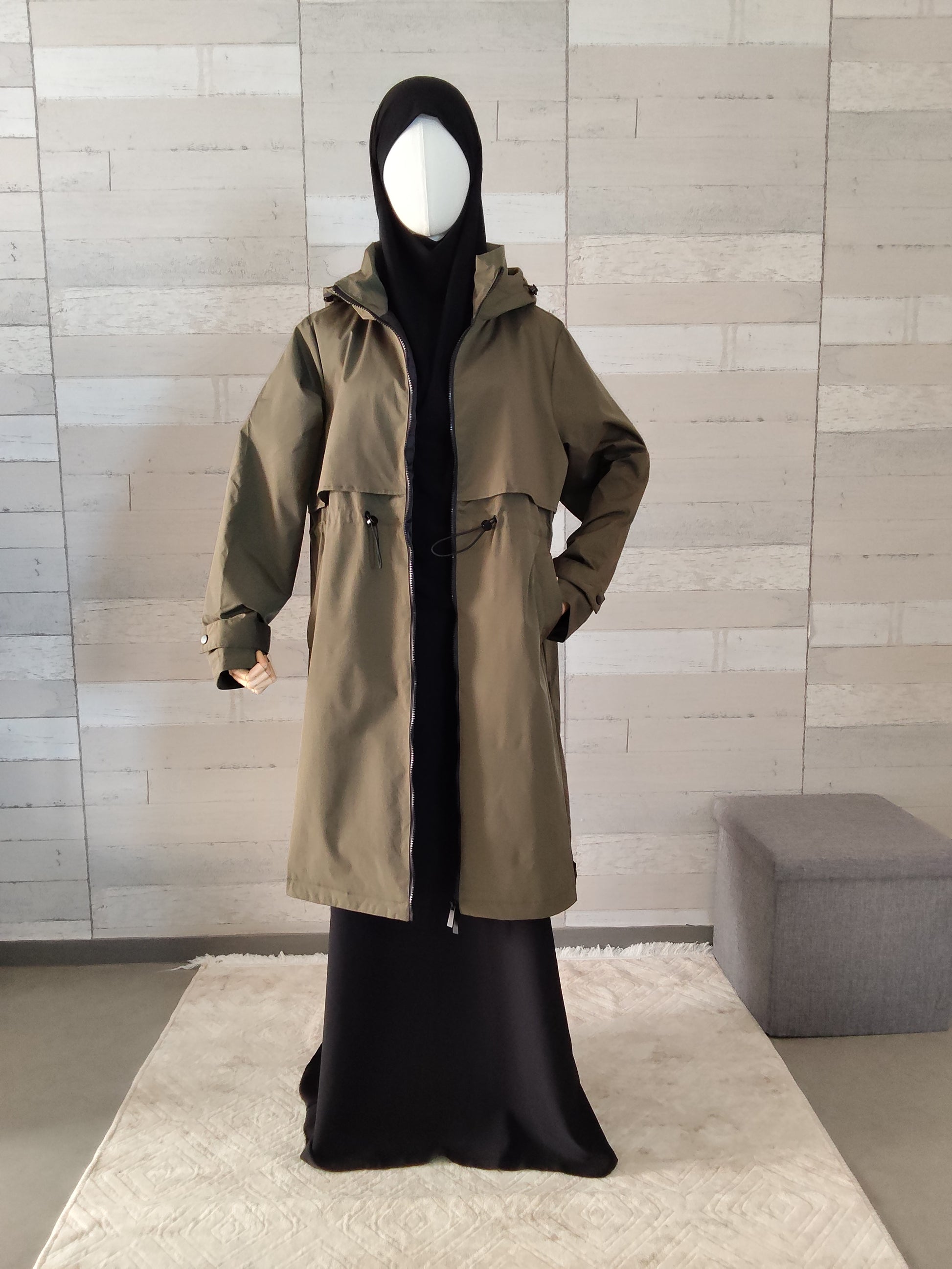 Parka longue kaki, arrivant juste en dessous du genou, avec fermeture à double sens et taille ajustable grâce à un élastique central.