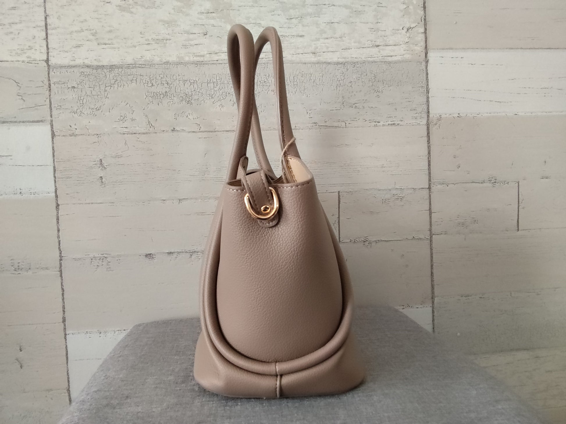 Sac à main taupe en simili-cuir grainé, élégant et pratique.