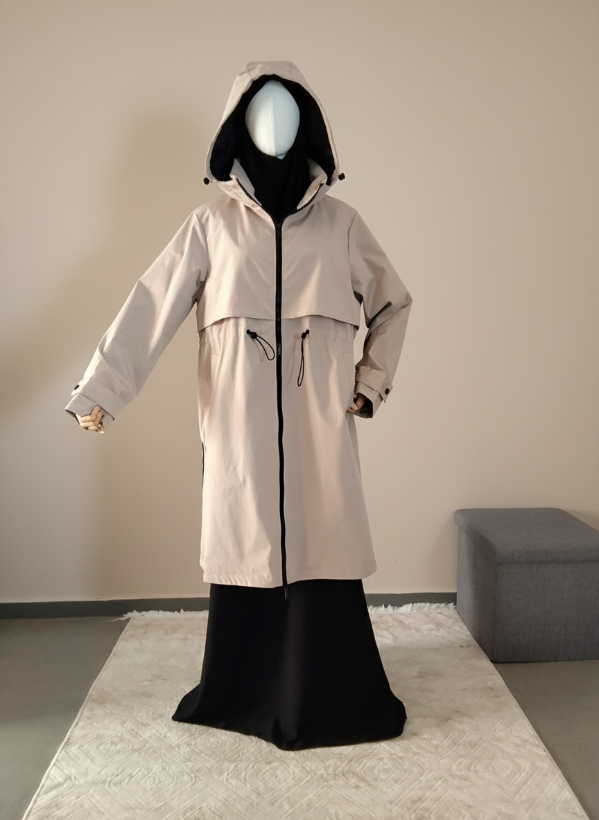 Parka longue beige, arrivant juste en dessous du genou, avec fermeture à double sens et taille ajustable grâce à un élastique central.